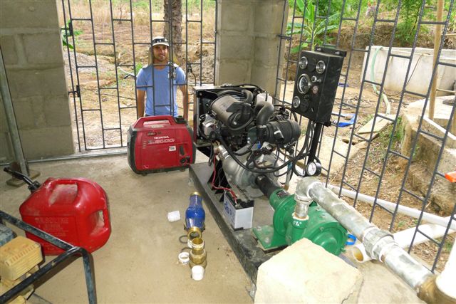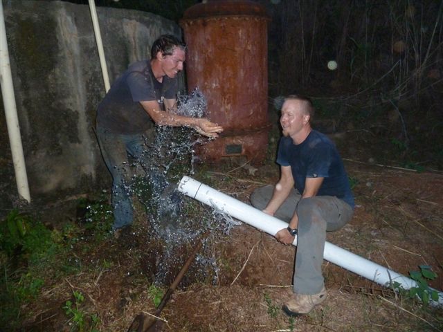 Drain the reservoir – rebuild the wall – back fill the wall with special clay – build new sand filter beds – install a new diesel water pump – lay 1 mile of 4 inch PVC pipe – celebrate the ability to now supply 5000 gallons a day to the entire hospital compound – (it is easy to write but a very difficult task) = another answer to prayer!
